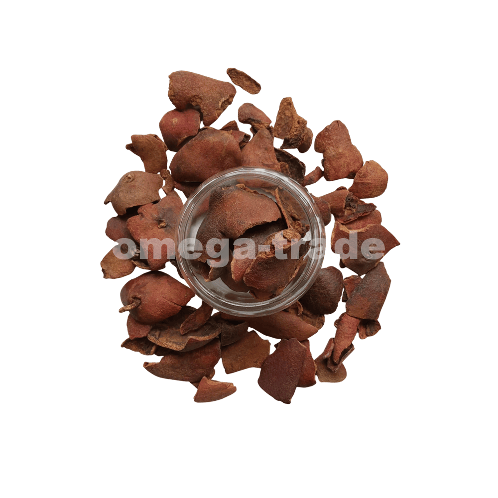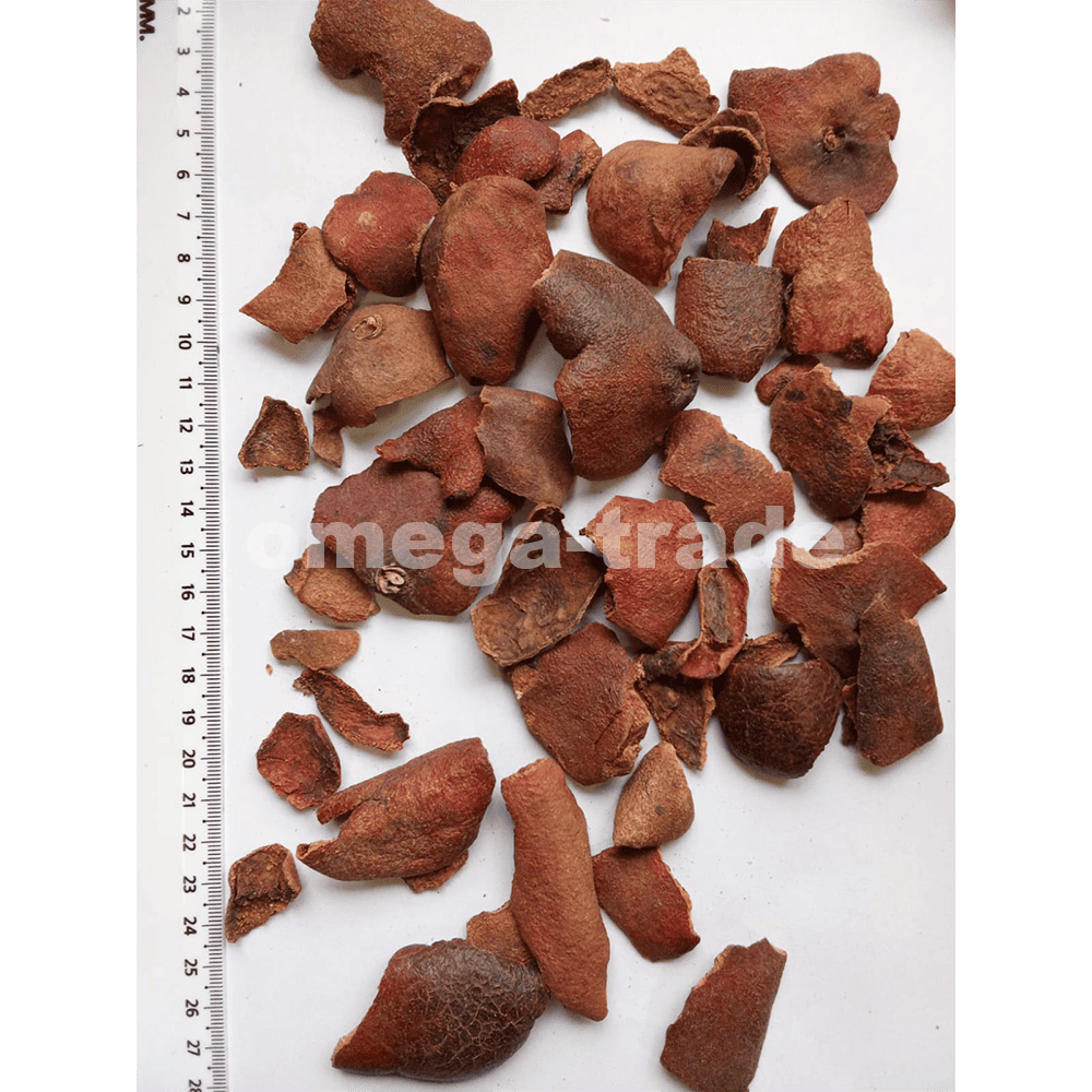 Высушенная внешняя кора плода, тёмно-коричневая, ароматная и сильно вяжущая на вкус за счёт высокого содержания танинов и антиоксидантов; её используют в кулинарии (для придания кислости и горечи, в приправках и маринадах), как основа для травяных чаёв и настоев, а также в народной медицине при расстройствах пищеварения, воспалениях и для обработки кожных проблем.