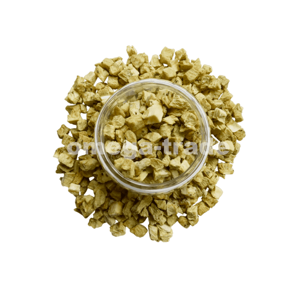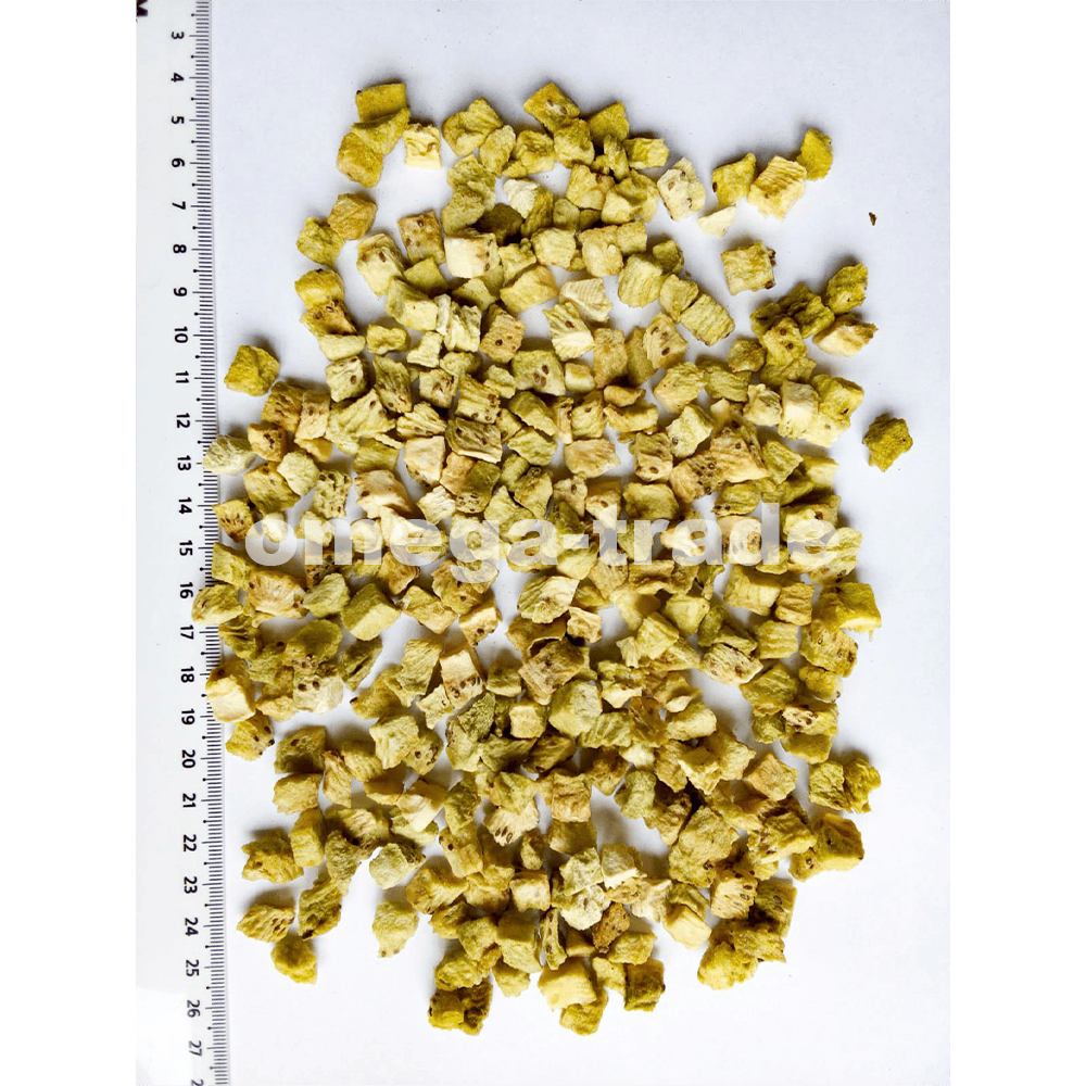 Киви, нарезанный на небольшие кубики, который прошел процесс сушки при низком давлении и температурах, сохраняя свой яркий вкус, характерную кислотность и питательные вещества. Этот метод позволяет продукту долго храниться, минимизируя потерю витаминов и минералов, что делает его отличным дополнением к различным кулинарным блюдам, таким как смузи, салаты и десерты. Сублимированные кубики киви удобны в использовании, что делает их идеальным выбором для тех, кто хочет наслаждаться экзотическим вкусом этого фрукта в любое время.