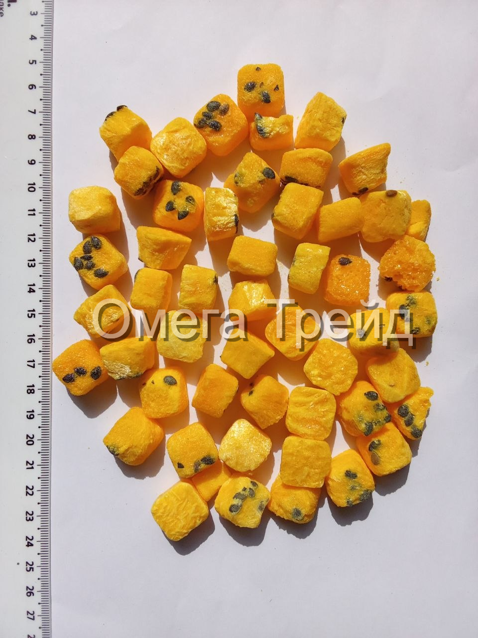 Маракуйя, нарезанная на небольшие кубики, которая прошла процесс сушки при низком давлении и температурах, позволяющий сохранить её насыщенный вкус, яркий аромат и полезные вещества. Этот метод обеспечивает длительный срок хранения и сохраняет витамины и минералы, что делает маракуйю универсальным ингредиентом для использования в различных кулинарных рецептах, включая коктейли, десерты и салаты. Сублимированные кубики маракуйи предлагают удобный способ наслаждаться экзотическим вкусом фрукта в любое время, делая его популярным выбором для любителей здорового питания.